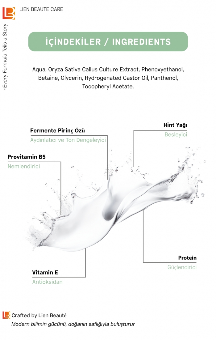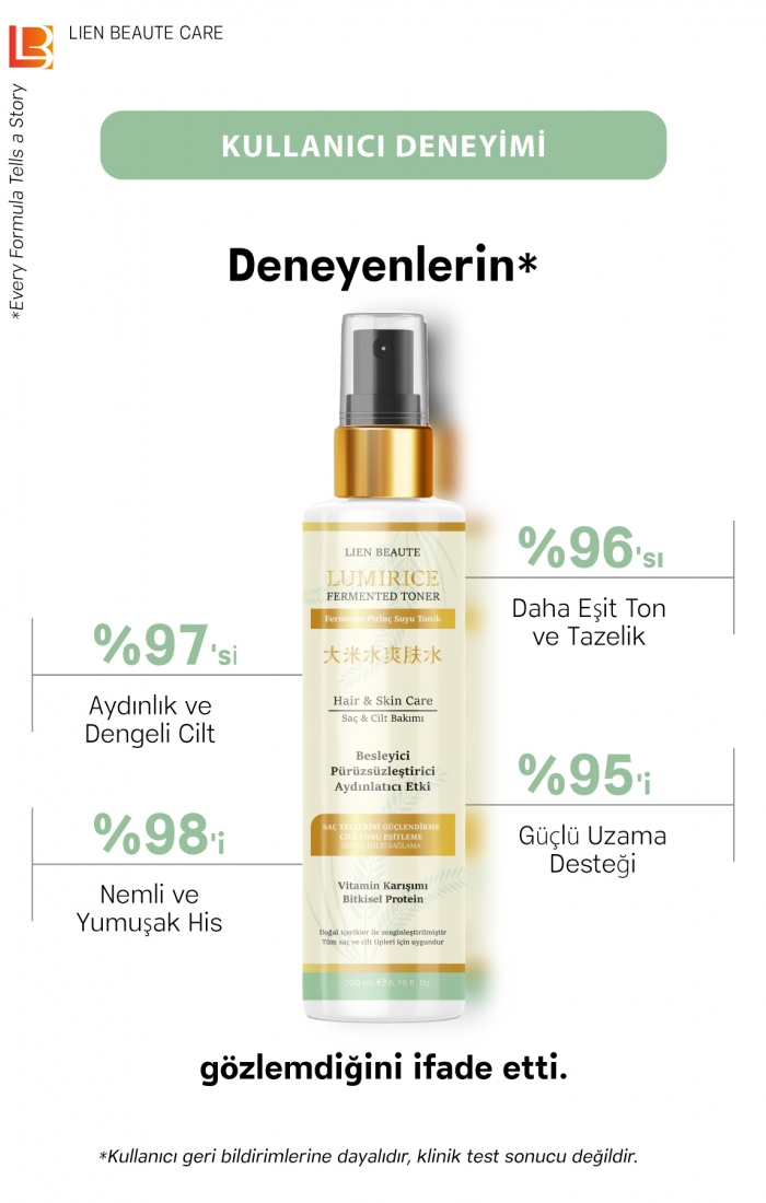 LumiRice Fermented Toner, cilt ve saç bakımı için ideal bir üründür.; Saçınızın ortasından uçlarına uygulama sağlayınız; saç diplerine de istenilen aralıklarla kullanılabilir.; Uygulama bittikten sonra, saçınızı tarak yardımıyla tarayarak ürünün dağılmasını sağlayabilirsiniz.; Cilt bakımında ise, sadece istenilen bölgeye püskürtmek yeterlidir.; Düzenli kullanımla saçları güçlendirir, sağlıklı uzamasını destekler.; Cilt tonunu eşitlemeye yardımcı olur.; Cildinizi besler, aydınlatır ve doğal bir ışıltı kazandırır.